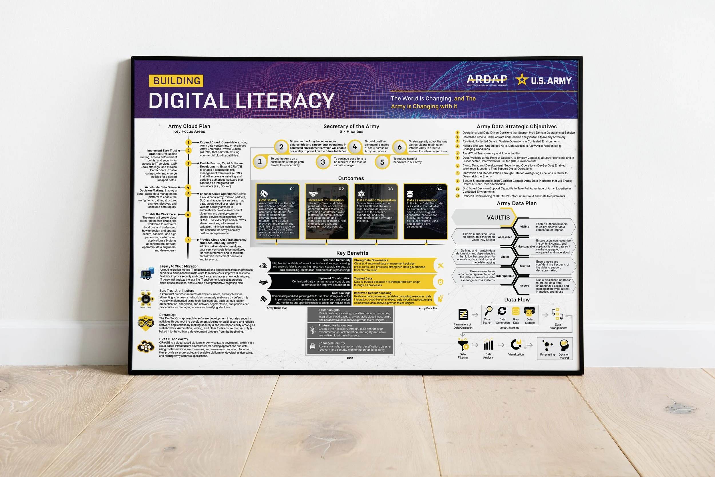 This infographic was designed to balance Army branding elements with a modern digital aesthetic, ensuring that it aligned with military standards while maintaining a clean, structured, and visually engaging layout. One of the biggest challenges was integrating a large amount of text-heavy content and technical data while keeping the design visually appealing, easy to read, and digestible. By leveraging strategic typography, structured layouts, and data visualization techniques, the final design effectively conveyed ARDAP’s mission and impact in a way that was both informative and visually dynamic. This project was recognized with a Graphic Design USA (GDUSA) Award in the Infographics category. ARDAP enables data platforms and integration to support decision-making and mission success for warfighters.